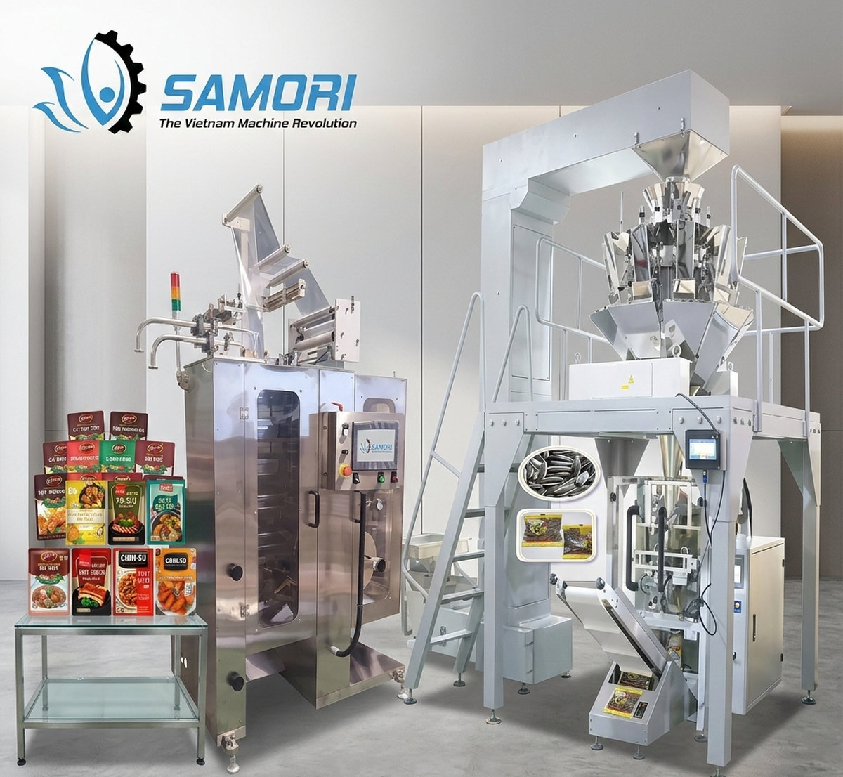 Máy đóng gói cân định lượng tự động Samori là thiết bị được ứng dụng rộng rãi trong hầu hết các cơ sở sản xuất và kinh doanh. Nhờ tích hợp hệ thống cân điện tử hiện đại, máy cho phép đóng gói sản phẩm với độ chính xác cao về khối lượng, giúp hạn chế hao hụt nguyên liệu và nâng cao hiệu quả sản xuất.